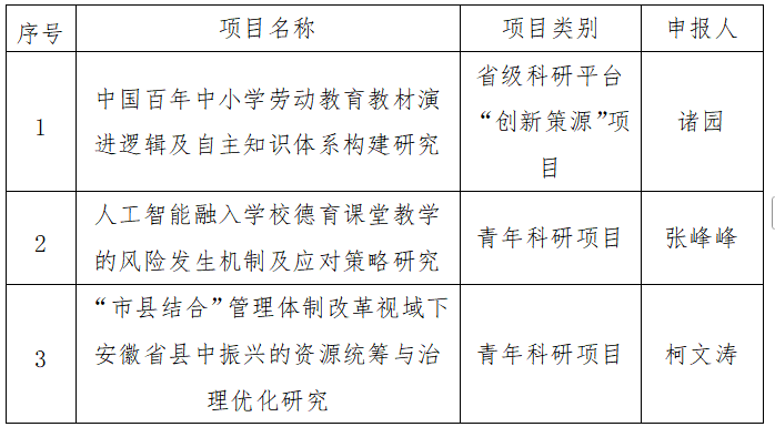 根据校科研处《关于组织申报安徽省教育厅2025年度科研项目的通知》要求,学院组织开展了2025年度安徽省教育厅科研项目申报工作。经个人申报、学院组织专人资格审查,学院学术委员会评议、党委会讨论、党政联席会审议,拟推荐以下项目(详见下表),现予以公示: