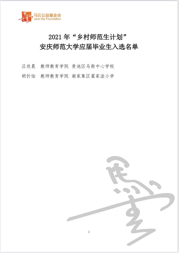 近日,2021年“乡村师范生计划”项目评选结果揭晓,Beat365官方网站教师教育学院小学教育专业2021届毕业生汪欣晨、胡忻怡等2名同学成功入选。