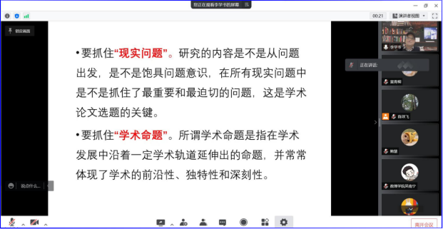 在谈到论文选题时,李博士指出选题要抓住“现实问题” 和“学术命题”,发现好的研究问题,并树立问题意识,在理论观点的争议中寻找问题,从阅读与交流中发现问题,从学校或学科发展中确定问题。在学术写作部分,李学书博士从期刊对学术论文的基本要求出发,对选题、文献收集、文献综述写作、学术论文的规范与风格等部分进行了深入阐释。最后,李学书博士结合自身的审稿经验对期刊发表进行了指导,包括选择有冲击力的论文题目、选择合适的期刊、把握恰当时机与编辑语言沟通和心灵对话,并希望青年学生以“非躺平”的方式走出科研“内卷” 重围,脚踏实地走科研之路。