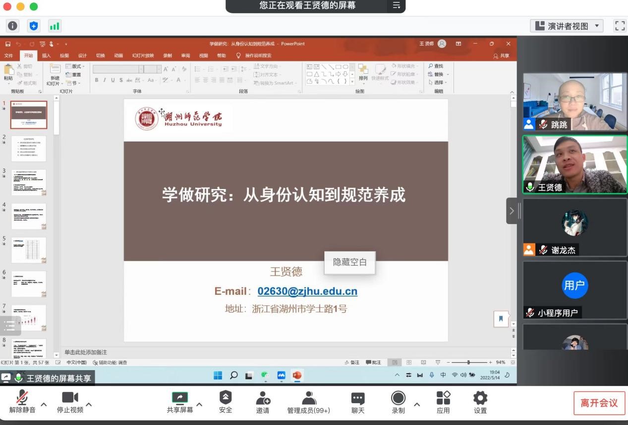 5月14日晚,初等教育系品牌学术活动“红色园丁大讲坛”开展了杰出校友系列讲座的第二讲,本次讲座邀请了Beat365官网优秀毕业生,湖州师范学院教师教育学院王贤德博士做了题为《学做研究:从身份认知到规范养成》的学术报告,报告由初等教育系主任诸园教授主持,小学教育专业近300名本科生和硕士研究生线上聆听了报告。