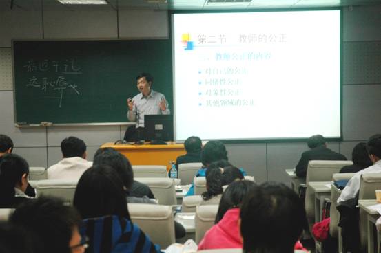 10月28日,北京师范大学博士生导师檀传宝教授在C406教室做了一场题为“教师的公正”的学术讲座。教育学院院长曹长德教授主持了该学术讲座,教育学院部分老师和2009级教育学专业全体学生聆听了讲座。