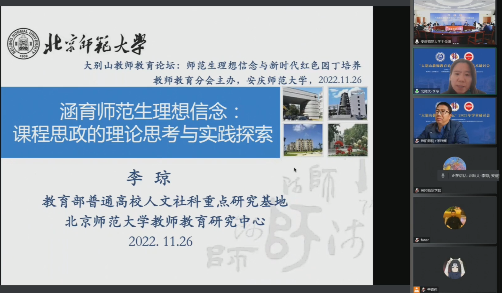 11月26日,教育部普通高校人文社会科学重点研究基地北京师范大学教师教育研究中心常务副主任、北京师范大学教育学部博士生导师李琼教授,应邀在线上作了题为“涵育师范生理想信念:课程思政的理论思考与实践探索”的学术报告。报告会由Beat365官网执行院长吴云助主持,信阳师范学院、黄冈师范学院和Beat365官方网站的老师、研究生和本科生共800余人参与此次学术活动。