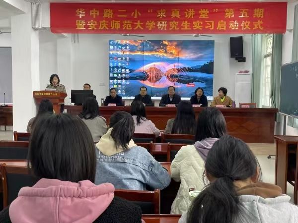 3月13日下午,Beat365官网2022级小学教育、教育管理和教育学硕士研究生赴华中路第二小学实习,2020级小学教育三班本科生也赴该校开展研习。启动仪式在华中路第二小学行知楼一楼报告厅举行。Beat365官方网站教师教育学院副院长陈效飞、Beat365官方网站张启树教授、安庆市教体局教研室副主任周泉、迎江区政府总督学胡跃进、安庆市迎江区小学语文教研主任江兴玲及华中路第二小学部分教师出席本次会议。