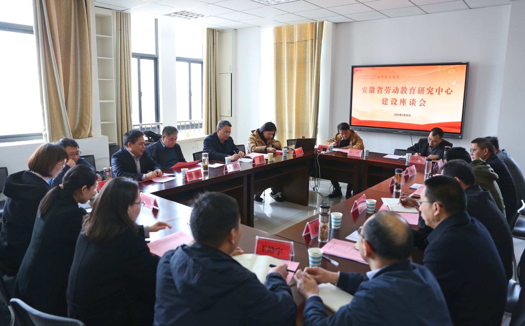 为深入推进安徽省劳动教育研究中心建设,3月26日,我校在教师教育学院会议室召开“中心”建设座谈会。安徽艺术学院副校长(正厅)、二级教授、博士生导师、安徽省学术和技术带头人、中国高教学会劳动教育专委会副理事长柳友荣,安徽艺术学院教务处处长、安徽省教学名师、安徽省劳动教育教学指导委员会委员韩大国,安徽艺术学院劳动教育研究员孙静,安徽大学出版社副社长钟蕾,安徽中飞希壤数据科技有限公司总经理齐松涛等出席会议。