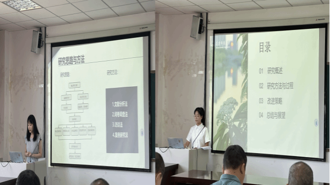 在答辩环节,答辩人首先通过PPT阐述自己的选题背景、研究目的、研究意义、研究方法、研究内容及创新点等。答辩评委对论文中出现的问题提出了针对性的建议。对于评委提出的问题,答辩学生认真记录,并积极做出回应。
