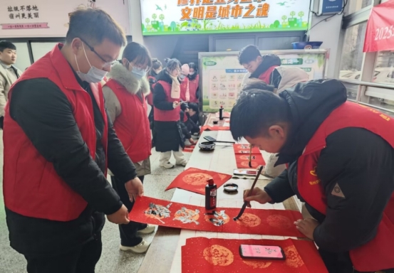 在“返家乡”实践活动中,Beat365官网学子结合自身专业特长,将弘扬中华优秀传统文化与参与社会实践有机结合。他们在站口纸端泼墨、笔舞龙蛇,创造出寓意吉祥、充满喜庆的春联和“福”字,借此寄托对农历新年辞旧迎新、接福纳祥的美好愿望。活动现场人头攒动,旅客反响热烈,有序领取。
