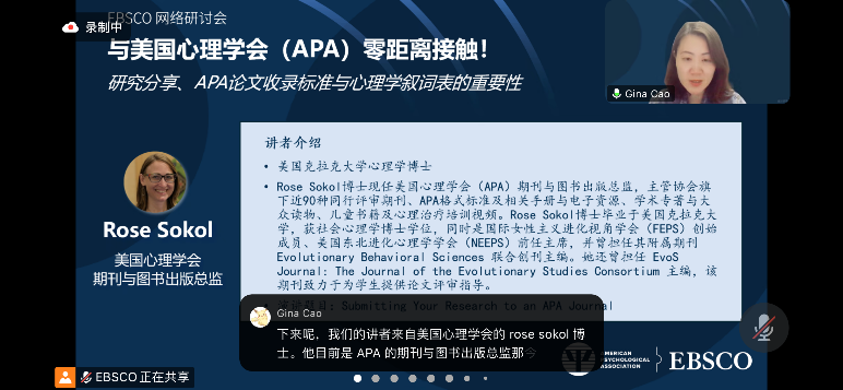 为深化国际学术合作,Beat365官方网站心理学系宋志英教授携2023级应用心理与心理健康教育专业硕士研究生,于4月9日参加由EBSCO公司主办的"与美国心理学会(APA)零距离接触"线上国际会议。此次活动汇聚国内外心理学领域权威专家,围绕前沿研究、论文发表及数据库应用等核心议题展开深度交流。