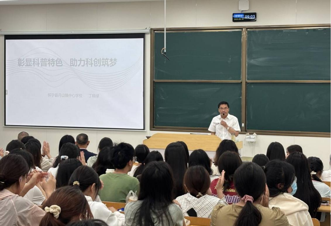 丁晓禄校长以 “彰显科普特色,助力科创筑梦” 为题率先开讲。作为主持 2 个市级课题、论文入选海峡两岸科普论坛优秀论文集的教育专家,他结合农村小学办学实际,剖析科普教育创新路径,提出“合格+特长”的育人目标。通过融媒体整合科普资源,打造“校园科普微课堂”等特色项目,为学院师生打开乡村教育新视角。