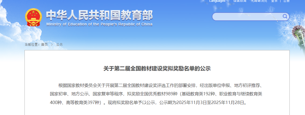 全国教材建设奖由国家教材委员会主办、教育部承办,是全国教材建设领域的最高奖。该奖项每四年评选一次,表彰在教材编写、出版、使用等环节中作出突出贡献的单位与个人,对引导教材建设方向、提升教材质量具有重要标杆意义。本届评选严格遵循“坚持正确导向、质量为先、公平公正”原则,从教材的政治方向、思想内涵、创新价值、编写质量、实践效果等多个维度进行全面考量,最终拟奖励全国优秀教材989种,其中,基础教育类192种、职业教育与继续教育类400种、高等教育类397种。(撰稿:孙兰 李佳莹 审核:潘锦云 赵丽丽)