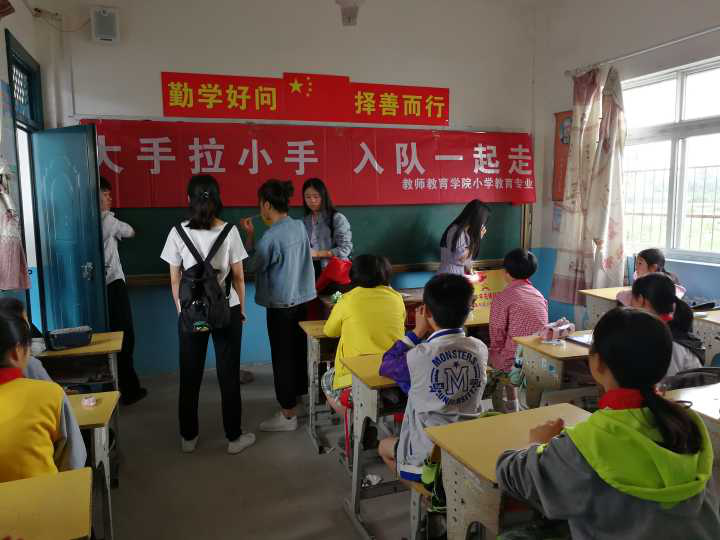 戴上红领巾,成为一名光荣的少年先锋队队员,是每个小学最期待的事情2018年5月30日,2017级小学教育二班的同学们在班级团支部的带领下,怀揣着激动的心情来到了立新小学开展大手拉小手,入队一起走”主题团日活动,为那里的小学生举行了一次特殊的入队仪式。