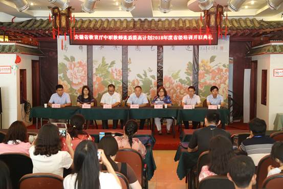 7月22日上午,由教师教育学院、省中职培训基地承办的安徽省教育厅中职教师素质提高计划2018年度省级培训项目在黄梅山庄隆重开班,继续教育学院院长刘燕、教师教育学院党委书记曹长德、院长吴云助、副书记许世平、副院长汪洋以及项目负责人郭启华教授、赵子刚博士、项目组工作人员以及全体学员等参加了开班典礼。开班典礼由继续教育学院院长刘燕主持。