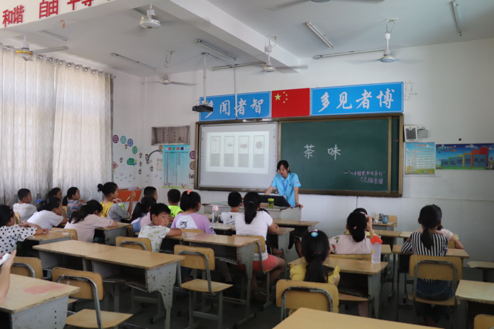“小朋友们,你们了解茶艺的形成过程吗?”“你们想知道茶的分类吗?”“你们想知道如何品茶吗?”“想!”同学们嘹亮的声音从教室里传了出来 。为了让孩子们深入了解茶艺文化,志愿者老师给学生们详细介绍了有关茶的诗句、故事、分类以及功效。