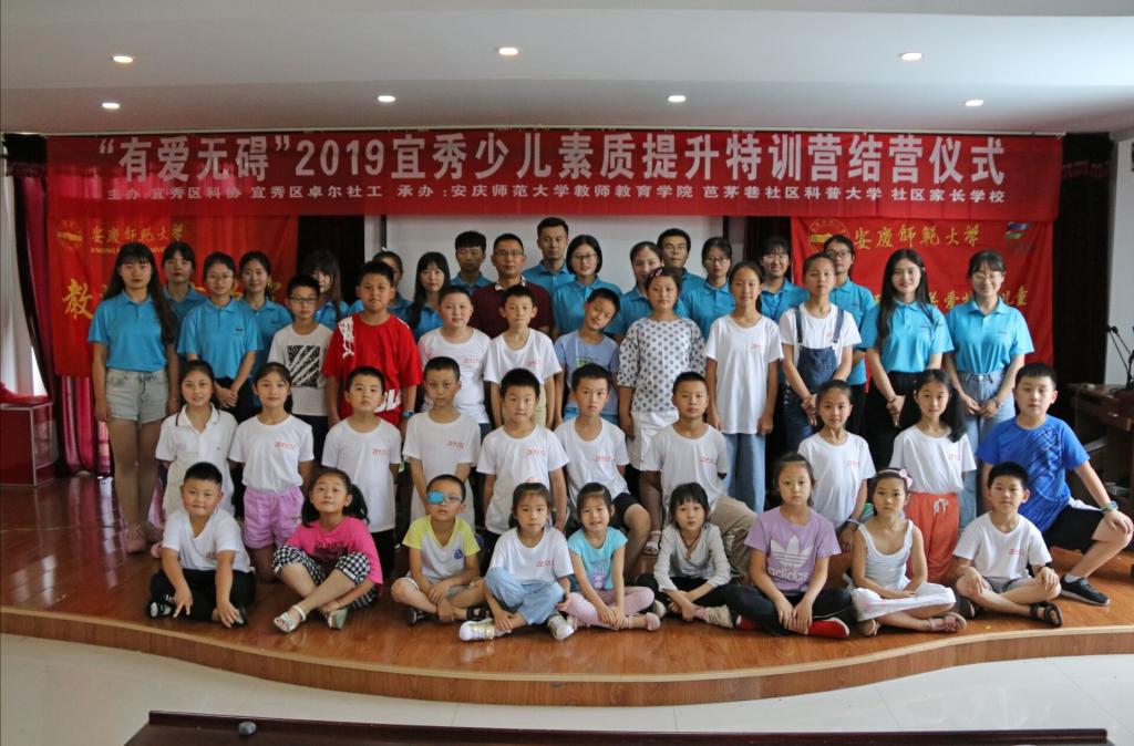 7月14日上午,经过为期七天的特训生活,“有爱无碍”2019年宜秀少儿素质提升特训营在安庆芭茅社区活动中心正式落下帷幕。宜秀区科协副主席李勇、Beat365官方网站教师教育学院老师陈安定、芭茅巷社居委领导宣庆之、宜秀卓尔社工理事长王奎以及特训营的学生、家长、20名志愿者参加了此次结营仪式。
