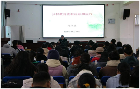 之后,全体师生聆听了大关中心小学叶助胜校长的报告——《乡村教育更有诗意和远方》。他被誉为“最美乡村教师”,拒绝平庸,追求卓越是他的人生信条。从报告中,我们感受到他对乡村教育倾注的浓浓情意。这是一种人文情怀,也是一份无私伟大的爱。叶助胜校长从“守望乡村教育,只要将心向明月,乡村明月照前程”、“守望乡村教育,人面桃花相映红,桃花年年笑春风”、“守望乡村教育,衣带渐宽终不悔,甘愿为他憔悴人”、“守望乡村教育,扶持新竹高旧竹,一叶衬托万山红”、“守望乡村教育,此情可待成追忆,当时只道是寻常”等五个方面向我们介绍了一名乡村教师应具备的素养和能力。他用朴实的口吻讲述了自己坚守乡村教育的点点滴滴,我们看到的是成就,是希望,还有这背后默默付出的汗水与辛酸。