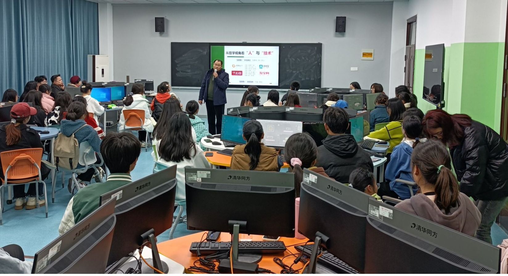 刘和海教授由哲学视角下的“人”与“技术”的关系谈起,简要分析了二者之间的“中介的关系”“他者的关系”“背景的关系”。然后,强调了技术必须同时具有内在价值和外在价值,即技术本身的功能性和解决问题的需求性,建议大家要学习技术,更要注重培养运用技术解决问题的能力;既要技术“上手”,会使用技术,更要技术“在手”,能活学活用。最后,刘和海教授给出“科学导入,注重内涵”“任务驱动,人人参与”“教学精彩,学习泛在”等三个案例,进一步分析信息技术在教育教学应用中存在的问题,并给出不同的解决方案和处理技巧。与会师生认为,从哲学观视角思考信息技术应用的实践逻辑,为提高技术绩效,追求技术的实践价值打下了良好的理论基础。