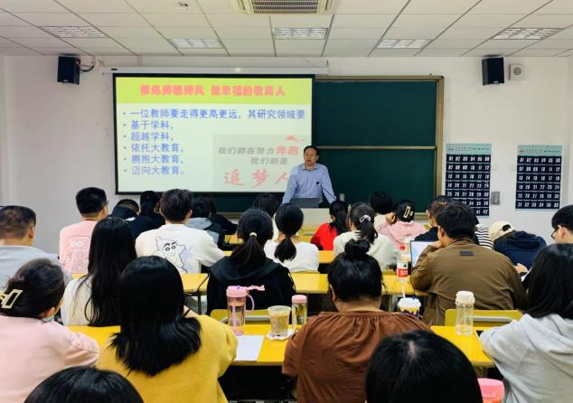 陈俊主任强调,师德师风是衡量教师队伍素质的第一标准,具备高素质的教师是实现高质量教育的根本前提。新时代的教师需具备三大核心素养:良好的职业态度、职业责任感以及扎实的职业本领。教师应树立幸福教育的梦想,构筑个人专业成长的梦想,追求打造魅力课堂的梦想,并积极探寻教育主张的梦想,最终成就科研兴教的梦想。