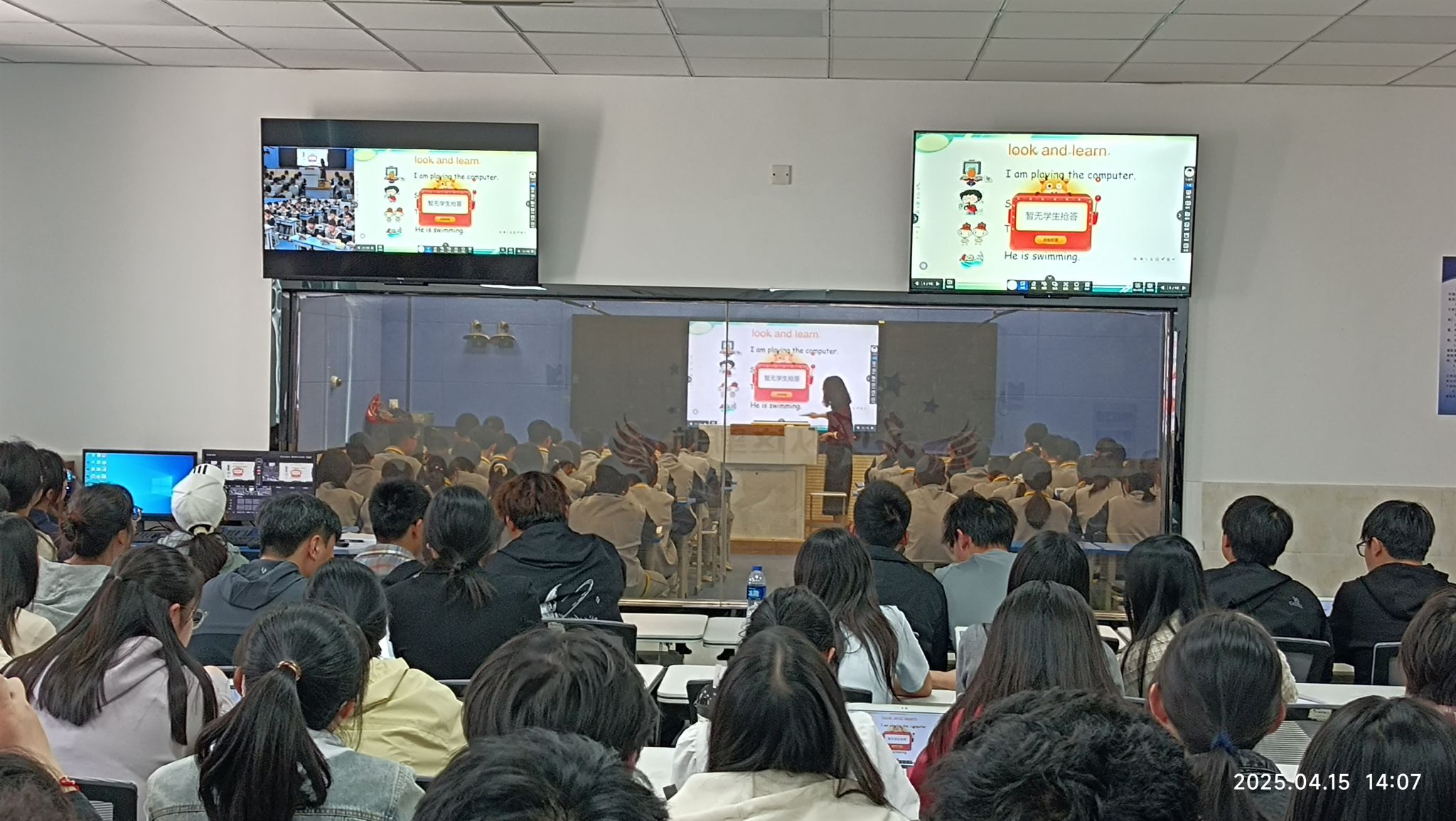 活动伊始,同学们观摩了刘爱萍老师的英语智慧课堂示范课。课堂上,互联网与教学深度融合,乐趣小游戏穿插其中,极大地激发了学生的学习兴趣。老师借助智能设备发布课堂任务,实时掌握每道题的正确率和答对人数,实现了教学效果的即时反馈。学生人手一台教学平板,与教师积极互动,课堂氛围十分活跃。同学们深刻体会到科技为教学带来的变革,不仅提升了教学效率,还让知识传递变得更加生动高效。随后,丁象老师分享了智慧课堂的引入与建构过程。他表示,每一个精心设计的课件、趣味盎然的游戏,都凝聚着老师们无数的心血。他鼓励教育技术学专业的学生紧跟时代步伐,不断提升自身能力,以适应教育领域日新月异的发展。