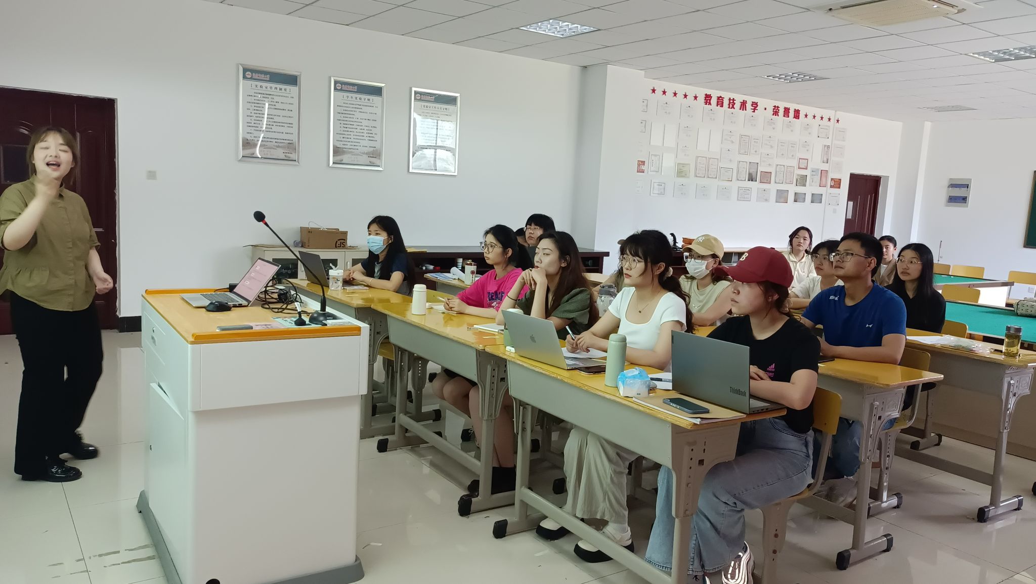 经过两个多小时的紧张比赛,沈若瑜、王杨、李星慧、杨茹婷等分获前四名,将代表教育技术学专业参加校赛。丁象老师在点评环节,首先充分肯定选手的精彩表现,认为教育技术学专业学生上课有激情,内容有深度,教学有思路,教学手段也非常多样化;其次,他针对每位选手的说课、讲课逐一点出不足,指明改进的方向,非常切中要害。