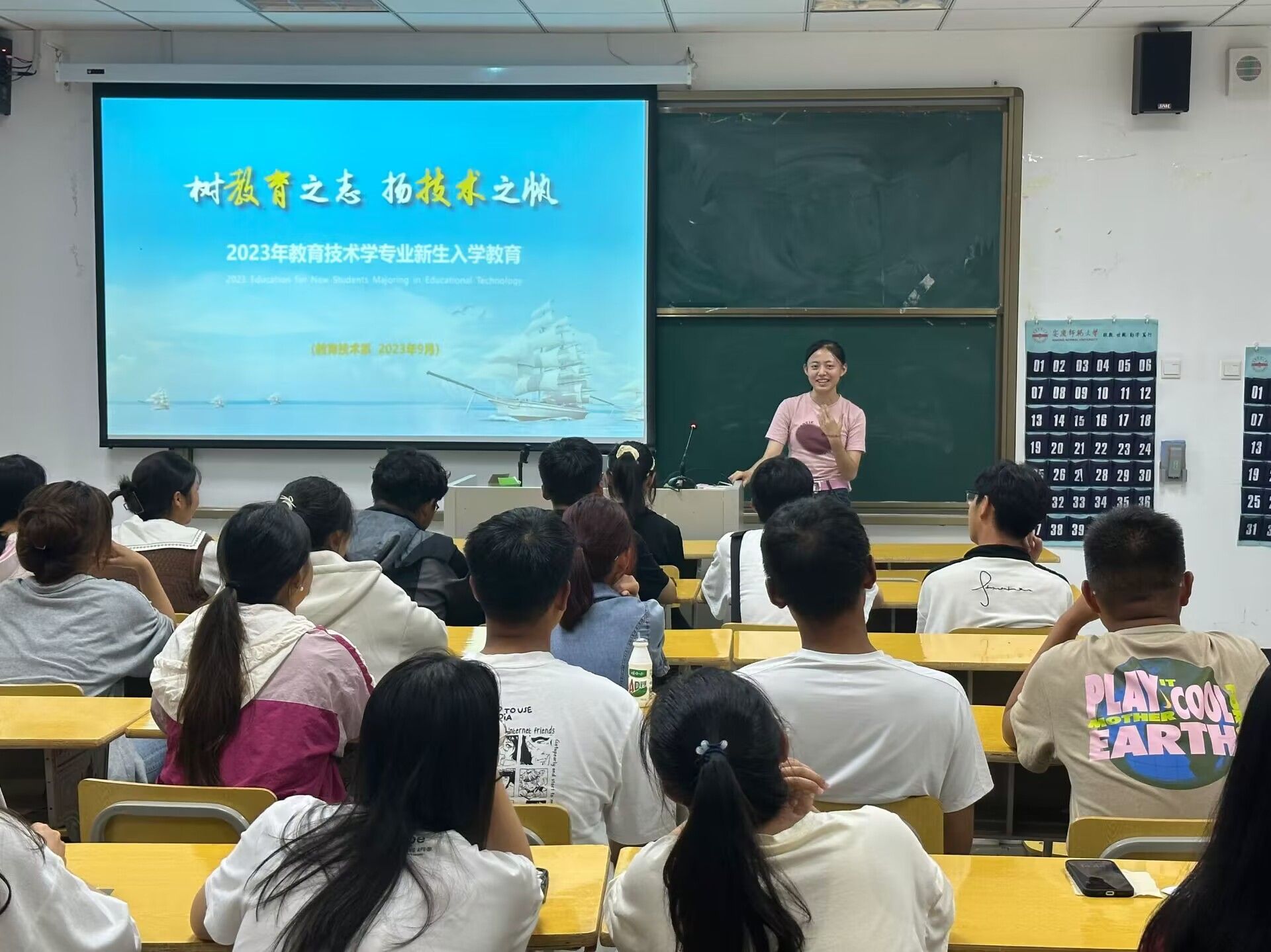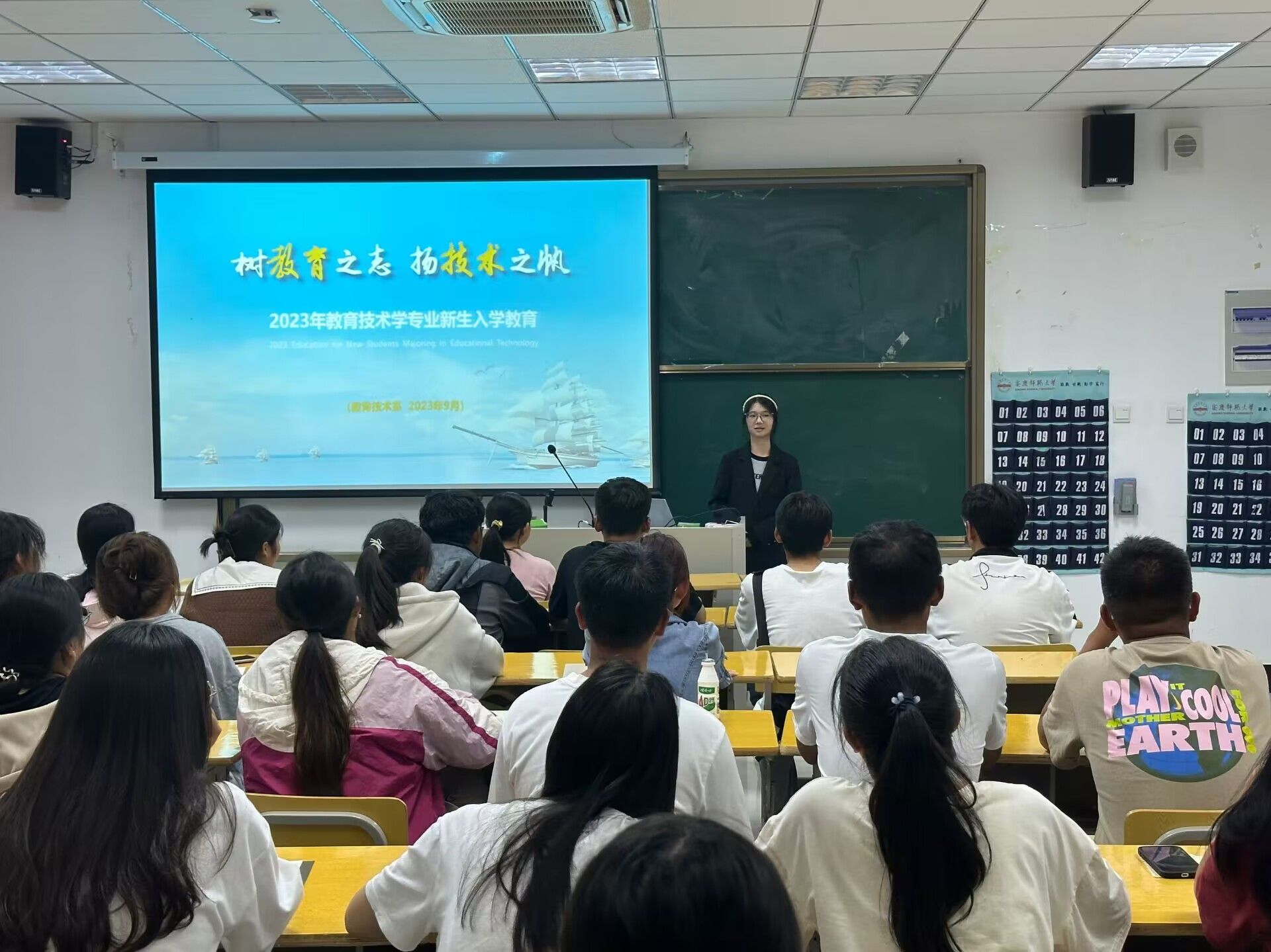 新生入学专业教育活动有四项内容。首先,全体师生共同观看《教育技术学专业宣传片》。该片由2020级、2021级、2022级教育技术学专业学生自编自导,配音剪辑完成,主要从学生视角讲述教育技术学专业现状,学生的学习、实践与生活,以及学生在学科竞赛、学业发展上取得的成绩等。通过观看宣传片,2023级新生可以获得教育技术学专业的第一体验感。