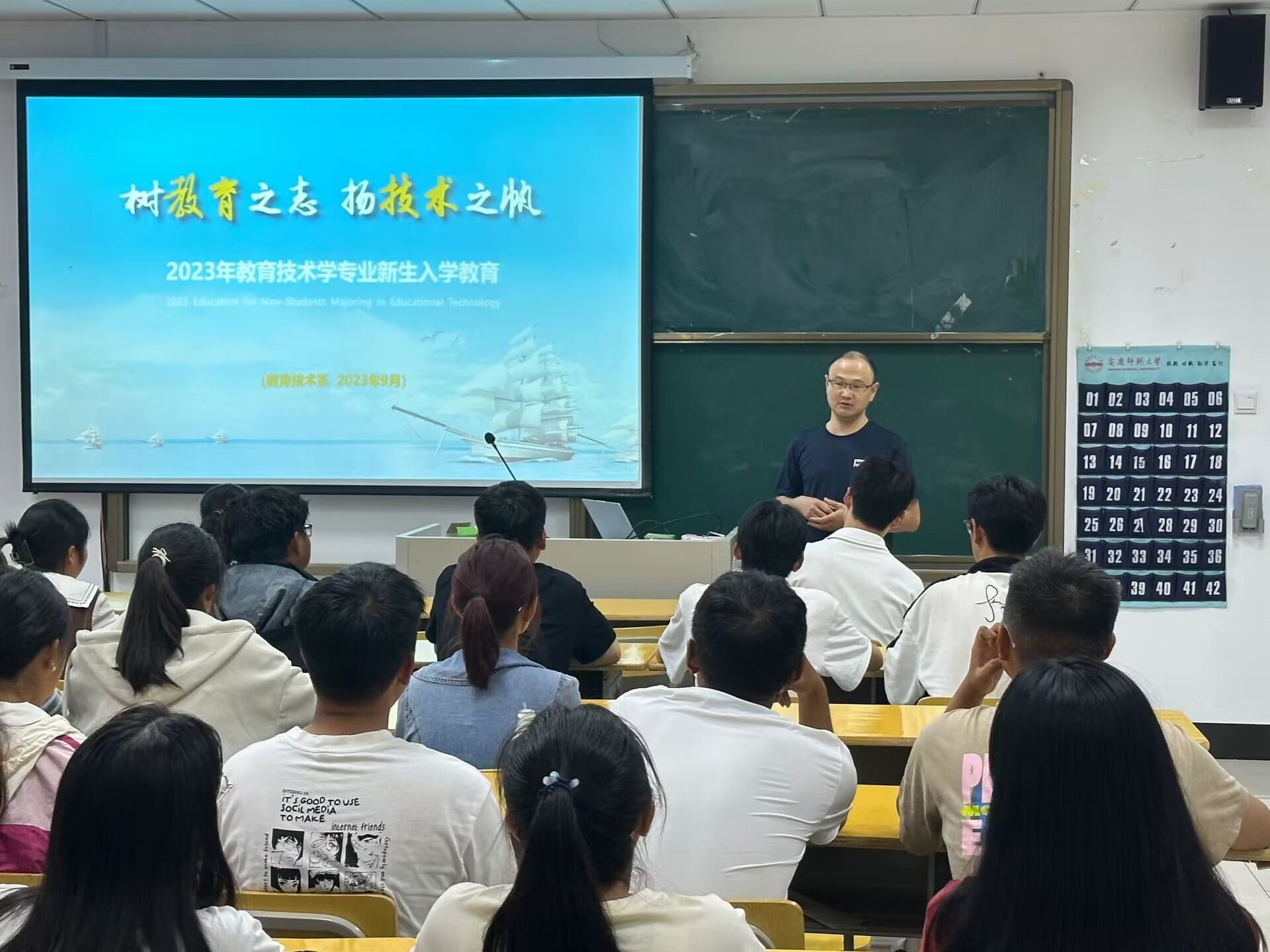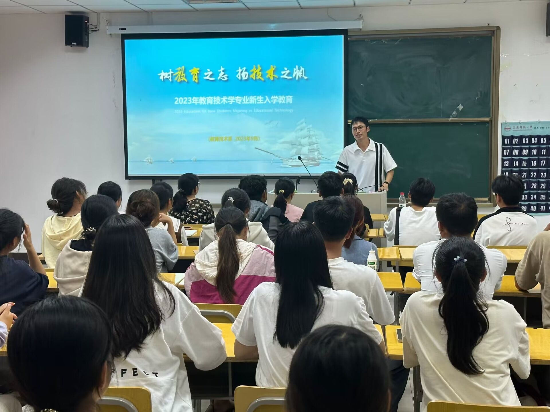 2023年9月20日,教育技术系开展2023级新生入学专业教育。教研室全体教师、优秀学生代表陈梦瑶(2021级)、杨茹婷(2022级),以及2023级教育技术学专业全体新生出席教育活动。活动由系主任韦伟主持。