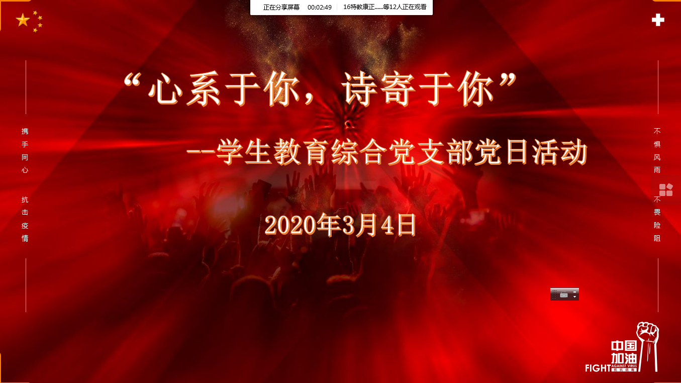 3419点,学生教育综合党支部以QQ群直播结合雨课堂的方式开展了题为“心系于你,诗寄于你”的特别党日活动,用诗歌创作表达对于新冠肺炎疫情防控的关注以及对于抗击在战“疫”一线工作者的牵挂,活动由支部书记刘文丽主持。