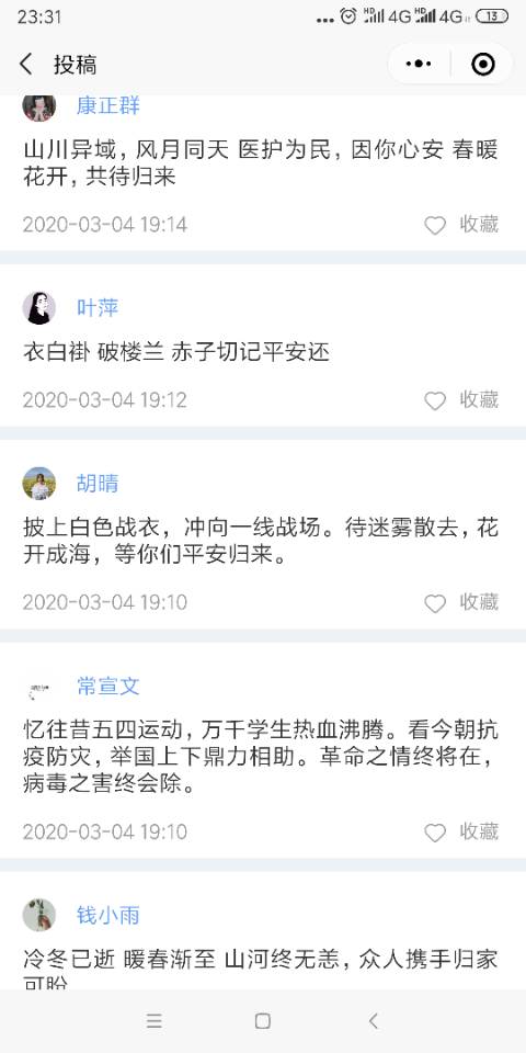 刘文丽老师说,疫情防控阻击战的形势越来越乐观,再次展现了中华民族众志成城、携手同心的勇气和力量,无数党员冲在防疫第一线发挥模范带头作用,作为学生党员,我们应向防疫工作者学习和致敬,诗歌寄情,聊表寸心。叶萍同学写下“衣白褂,破楼兰,赤子切记平安还”表达了对于医护人员的美好祝愿,李天慧用“生活常羁绊,但也藏彩蛋,只要众志坚,病毒何生还?”表达了终将战胜疫情的乐观精神。