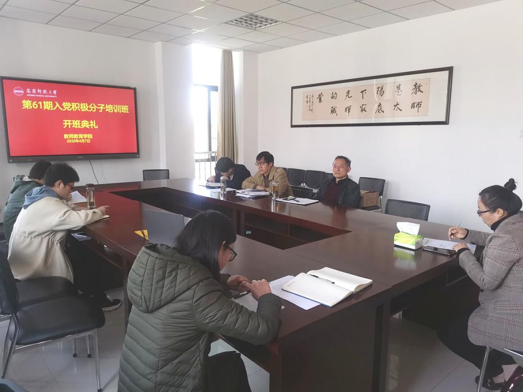 为提高入党积极分子思想政治觉悟,端正入党动机,把好党员培养教育发展质量关,4月8日下午教师教育学院分党校采用QQ线上的形式,举行第61期入党积极分子培训班开班仪式。学院党委书记曹长德、党委副书记许世平、各学生党支部书记出席,学院88名入党积极分子通过QQ群课堂参加。