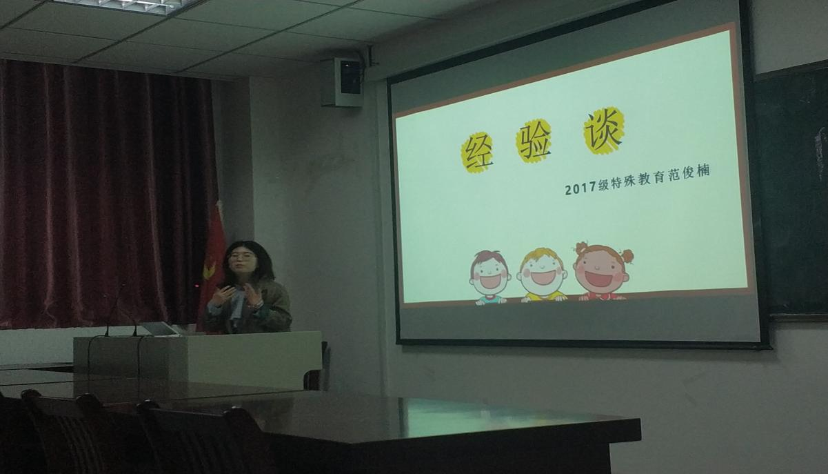 415日,特殊教育专业在J305开展本科生学习经验分享交流会。会议邀请了2017级特殊教育专业范俊楠、冯子贵两位同学做学习经验报告,特殊教育专业部分教师和全体在校本科生参加了交流会。