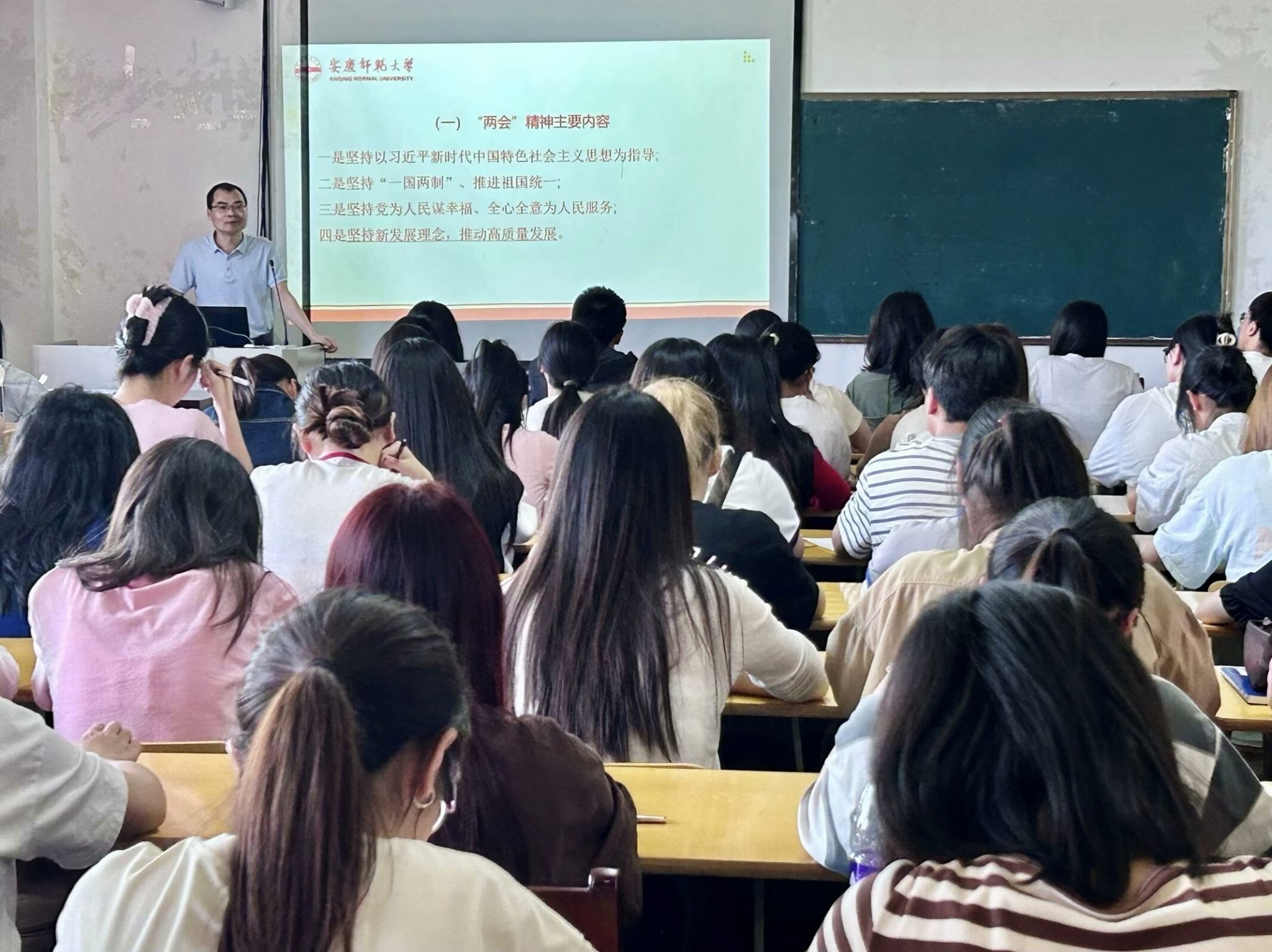 5月8日,Beat365官网在J305教室开设《学习全国两会精神,勇担青年光荣使命》专题党课。学院党委委员、副院长陈效飞担任主讲人,全体第69期入党积极分子参加此次学习。