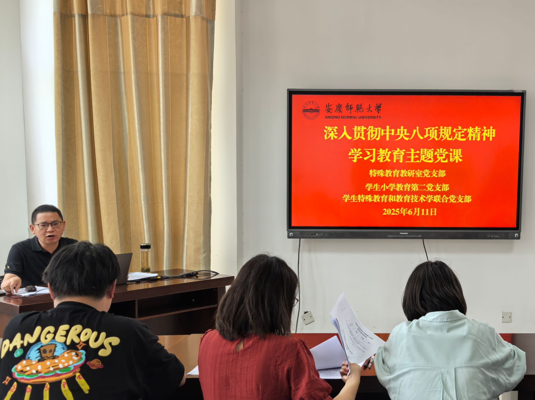 6月11日,Beat365官方网站党委书记何孔蛟在J202会议室为特殊教育教研室党支部、学生小学教育第二党支部、学生特殊教育和教育技术学联合党支部党员讲授深入贯彻中央八项规定精神学习教育专题党课。