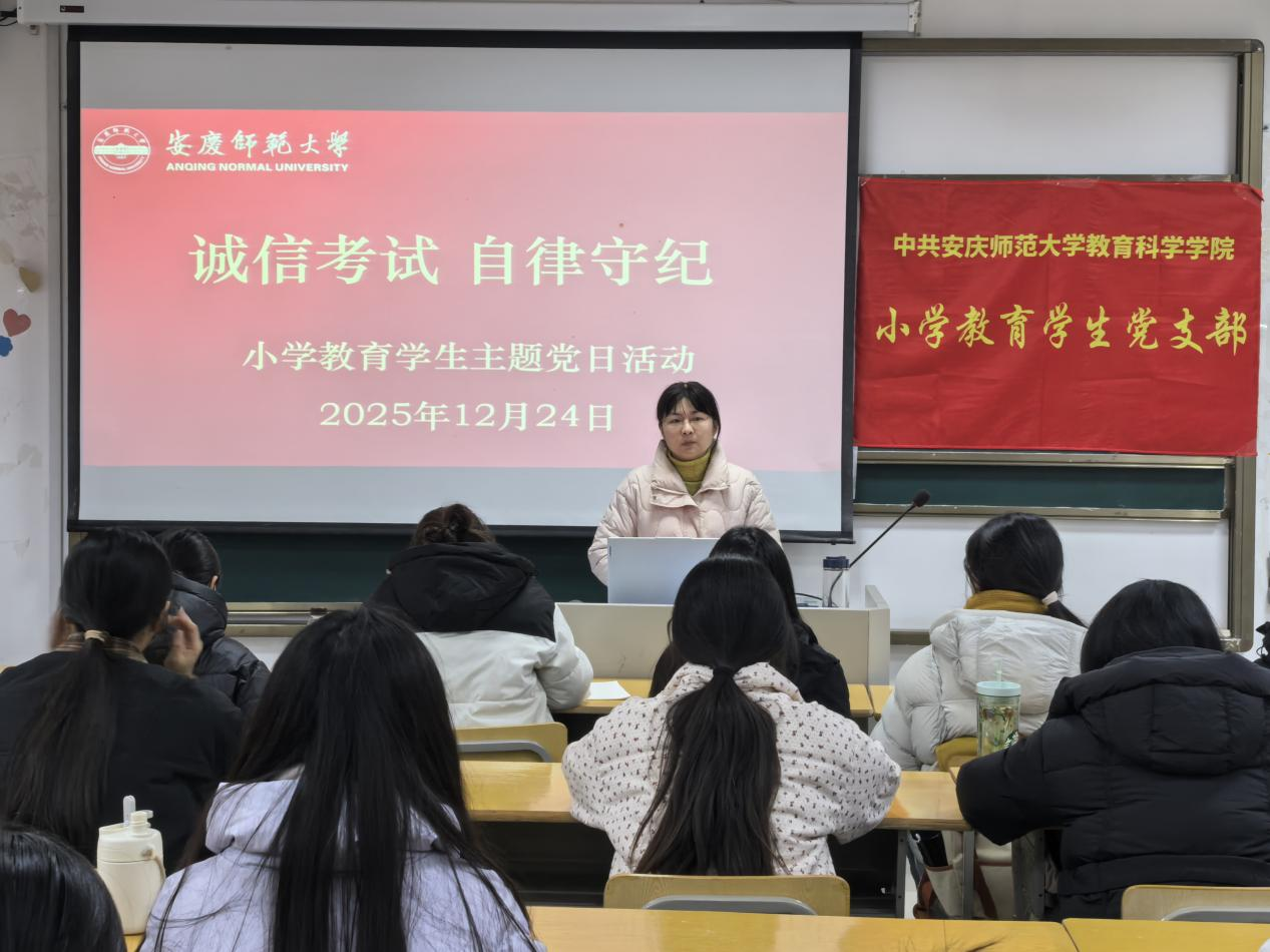 为强化学风建设、营造诚信考风,12月24日,Beat365官网小学教育学生党支部在J221教室组织开展“诚信考试,自律守纪”主题党日活动。活动由党支部书记张文君主持,全体学生党员与入党积极分子参加。