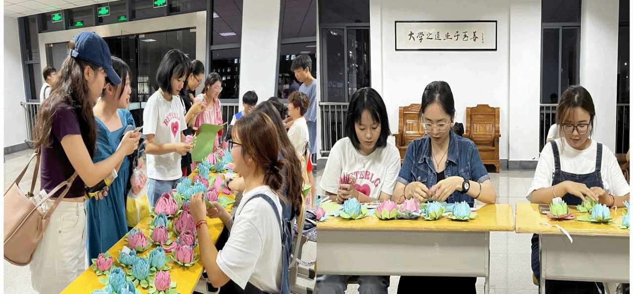 一盏花灯一片情。学生们在工作人员的指导下手工制作,绘图、剪花、组装、粘贴、系绳……大家有条不紊地进行各项制作程序。活动中,相互交流方法技巧分享生活点滴并交流感受。从叶子到花瓣,每一片,每一层都聚精会神、一丝不苟,一盏盏活灵活现的花灯慢慢在同学们手中“绽放”。同学们以花灯对祖国深情告白,以昂扬的青春面貌同庆盛世华诞。