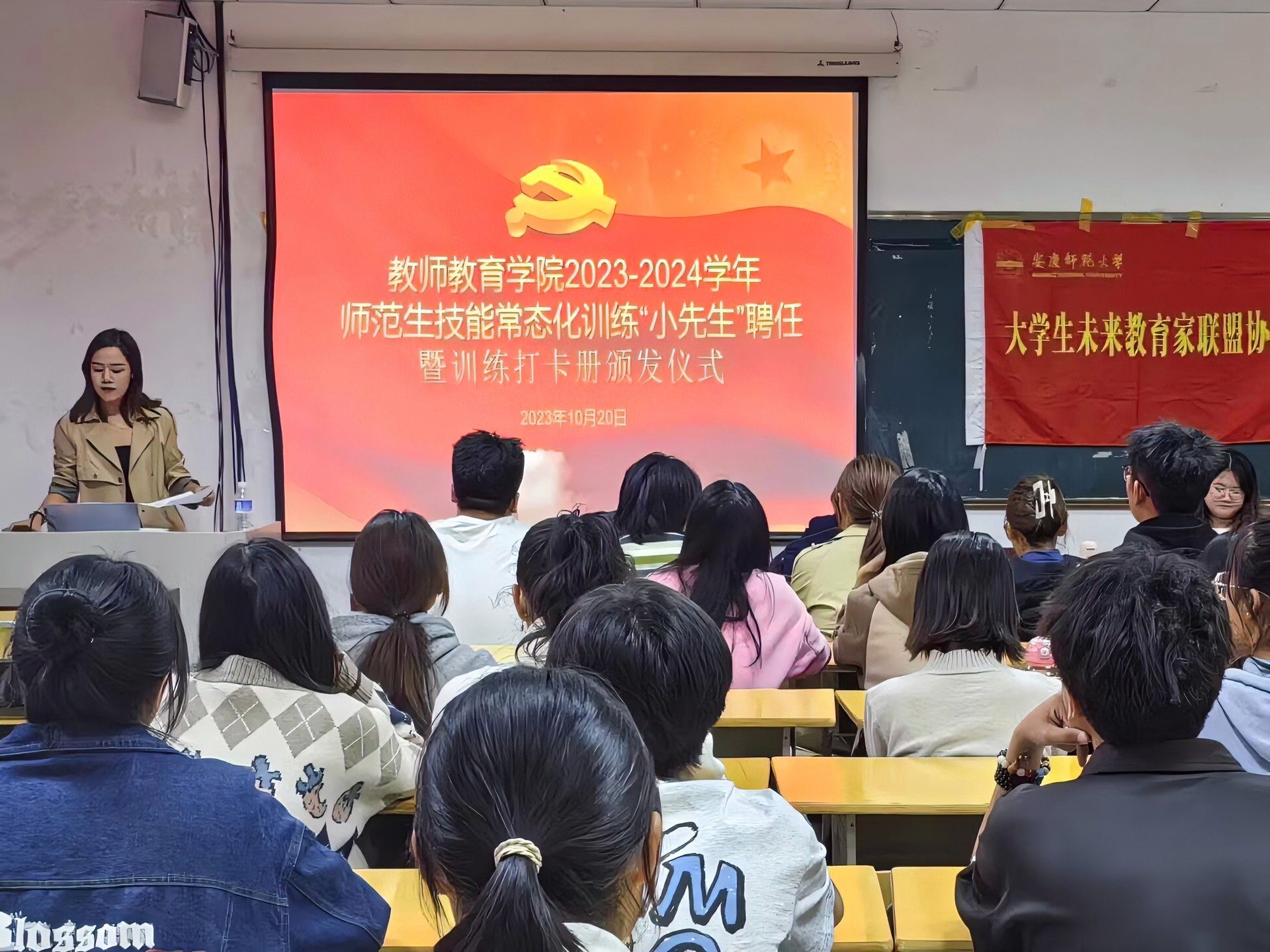 10月20日,Beat365官网在J305开展2023-2024学年师范生技能常态化训练“小先生”聘任以及训练打卡册颁发仪式。院党委副书记许世平,新生辅导员汪悦、汪洋洋,2023级新生代表,20余名新聘“小先生”到场参加,本次活动由团学负责老师姚强诚主持。