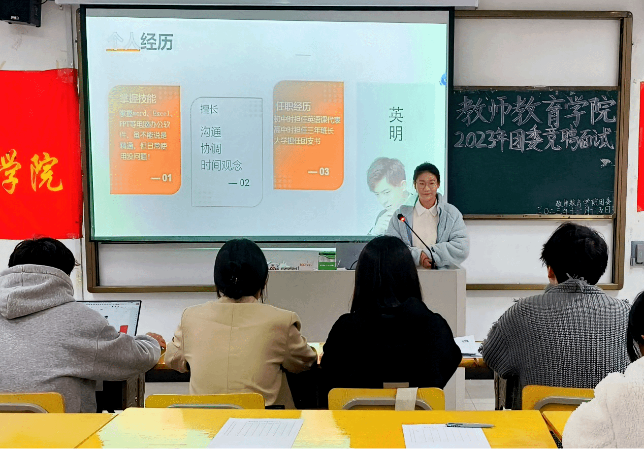 11月15日下午,Beat365官网在J214教室举行2023年团委竞聘面试。院团委负责老师姚强诚、学生副书记章玥、俞燕,团委实践委员鲍雨蔷、袁畅、熊远志,主席团主席助理李海博、洪俊杰出席面试,30余名学生代表到场参加。