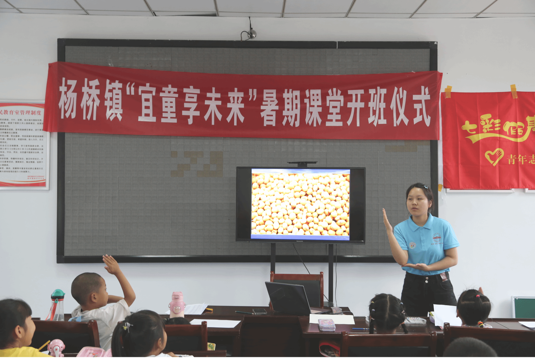 7月11日,“青·敬敷”Beat365官方网站“以劳润心,怀爱护蕾”教育关爱实践团在杨桥镇带领参与“宜童享未来”暑期课堂的40余名学生进行了主题为“赓续农耕文明,培育乡土情怀”的农耕文明介绍。