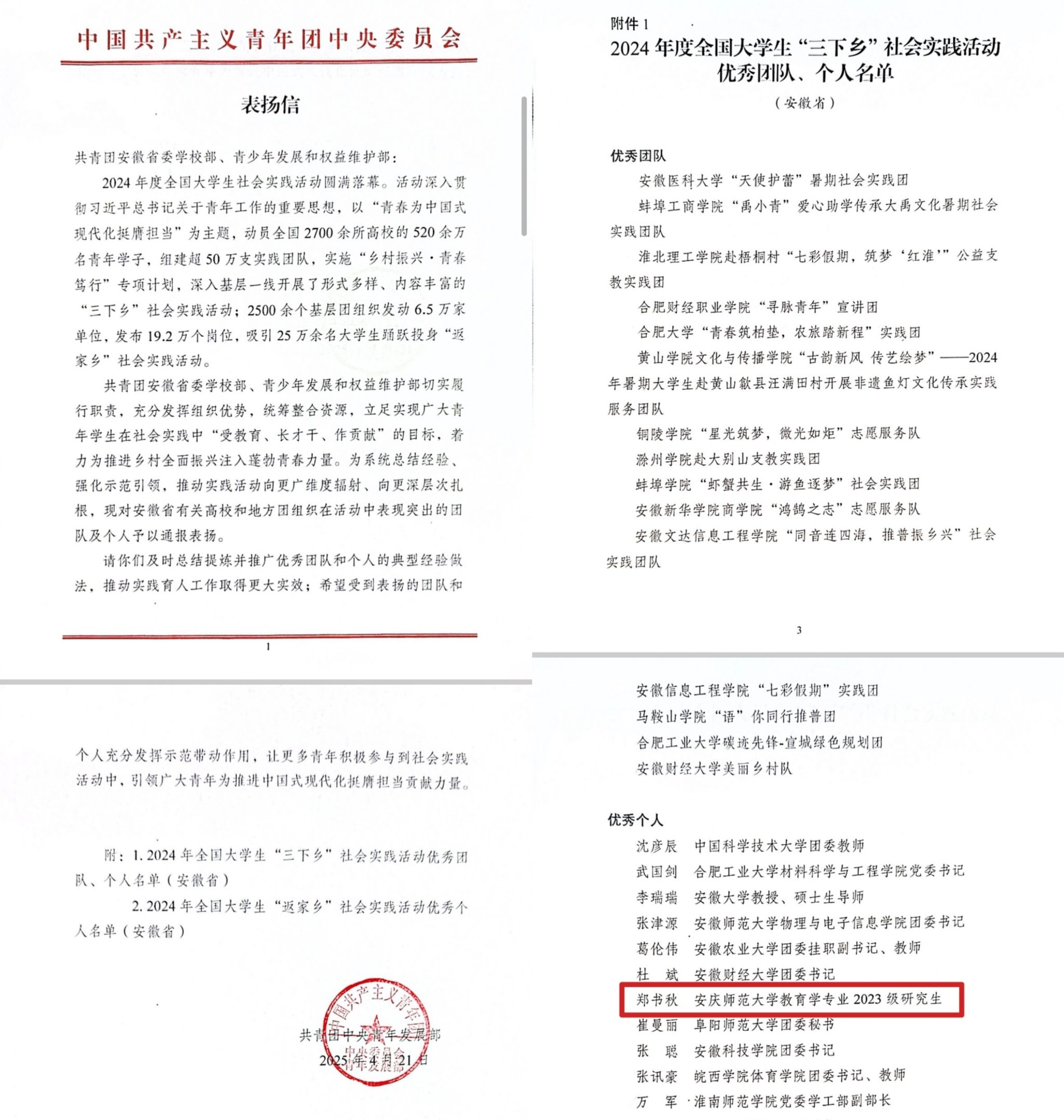 祝贺Beat365官网教育学专业2023级研究生郑书秋同学,荣获2024年度全国大学生“三下乡”社会实践活动优秀个人称号。(审核:姚强诚、许世平)