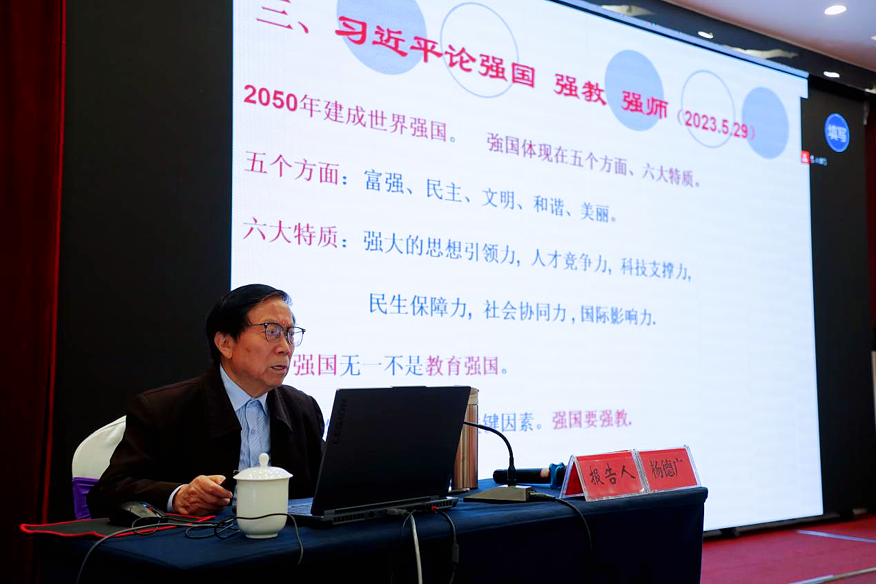 在主旨报告阶段,杨德广以“面向新时代,学习和践行教育家精神”为题作报告。他阐述了“教育家”精神的内涵,结合自己从农家子弟成长为大学校长,实现“读书梦”“图强梦”“教育梦”“慈善梦”的人生经历,激励大家坚定理想信仰,树立强烈的使命感和责任感。他认为,教育家精神不仅是对教育事业的热爱与执着,更是在育人道路上的奉献与担当。